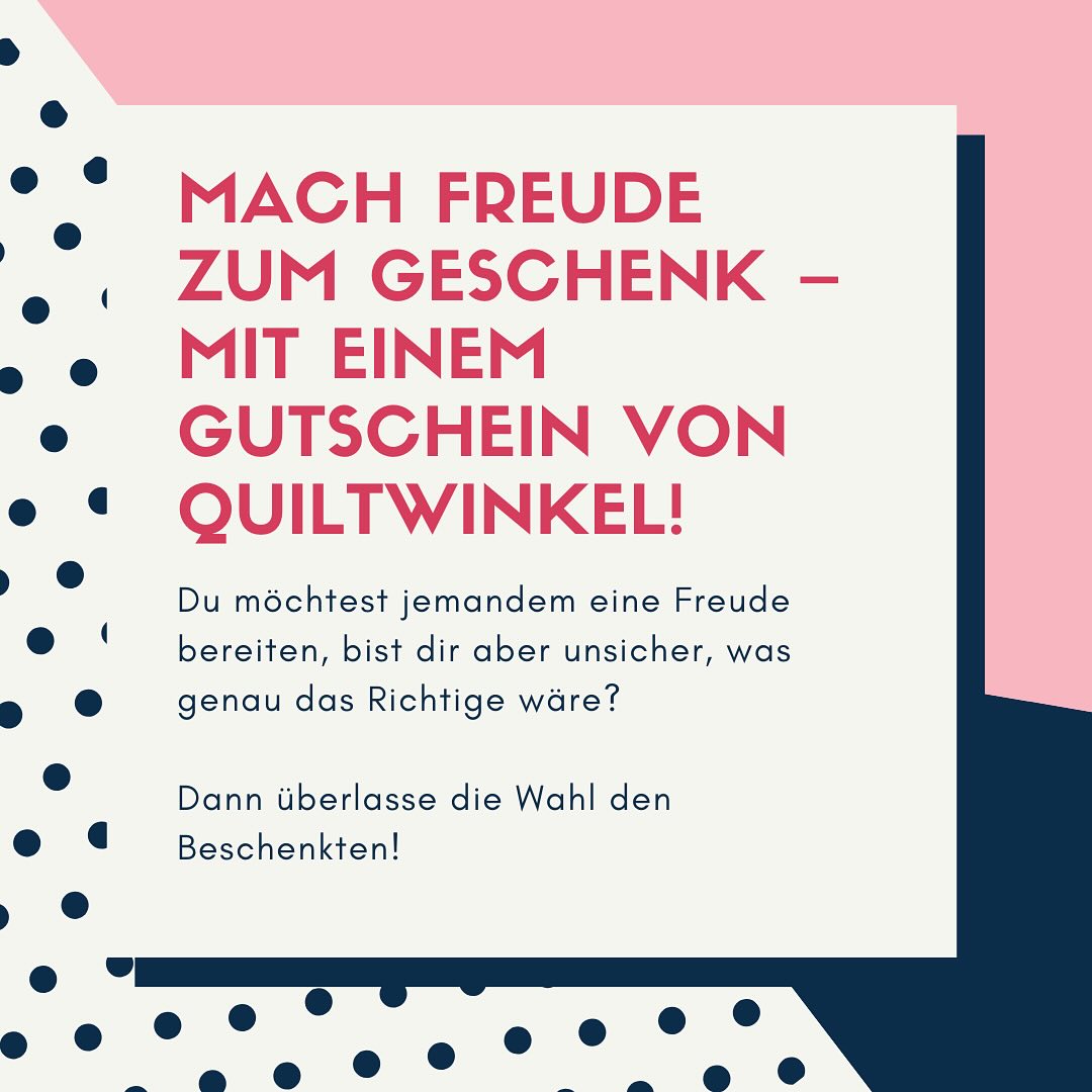 Mach Freude zum Geschenk – mit einem Gutschein vom Quiltwinkel! Du möchtest jemandem eine Freude bereiten, bist dir aber unsicher, was genau das Richtige wäre? Dann überlasse die Wahl den Beschenkten! Mit einem Geschenkgutschein vom Quiltwinkel machst du Nähbegeisterten, Patchwork-Fans oder kreativen Köpfen ein Geschenk, das garantiert gut ankommt. Ganz neu: Du hast jetzt die Wahl zwischen zwei Varianten: ✨ Digital und flexibel – Perfekt für die Last-Minute-Idee! Du erhältst den Gutschein bequem per E-Mail, kannst ihn zu Hause ausdrucken und direkt verschenken. ✨ Gedruckt und besonders – Ich kümmere mich um alles, gestalte den Gutschein liebevoll und schicke ihn dir fertig zum Verschenken per Post. Egal, ob digital oder klassisch: Mit einem Quiltwinkel-Gutschein verschenkst du kreative Möglichkeiten und viel Freude! Welche Variante passt besser zu dir? 💌 #quiltwinkel #mein_quiltwinkel #gutschein #freudeverschenkenButton