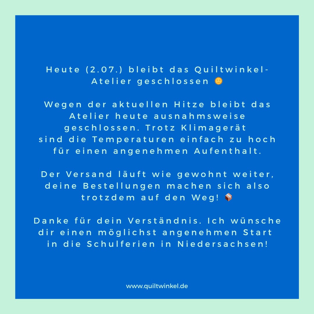 Heute (2.07.) bleibt das Atelier geschlossen 🌞 Es ist einfach zu heiß. Trotz Klimagerät ist an entspanntes Arbeiten nicht zu denken. 📦 Der Versand läuft wie gewohnt weiter! Ab morgen Nachmittag ist das Atelier wieder für dich geöffnet. Ich freu mich auf dich! #quiltwinkel #hitzefrei #atelierpause #versandläuft #patchworkliebeButton